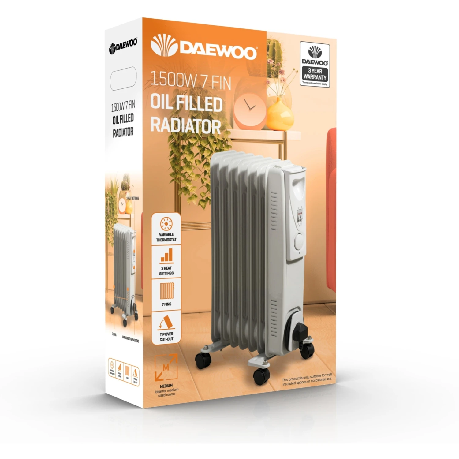This powerful and portable Daewoo oil filled radiator is the perfect solution to warm up a home, garage, workshop or office.