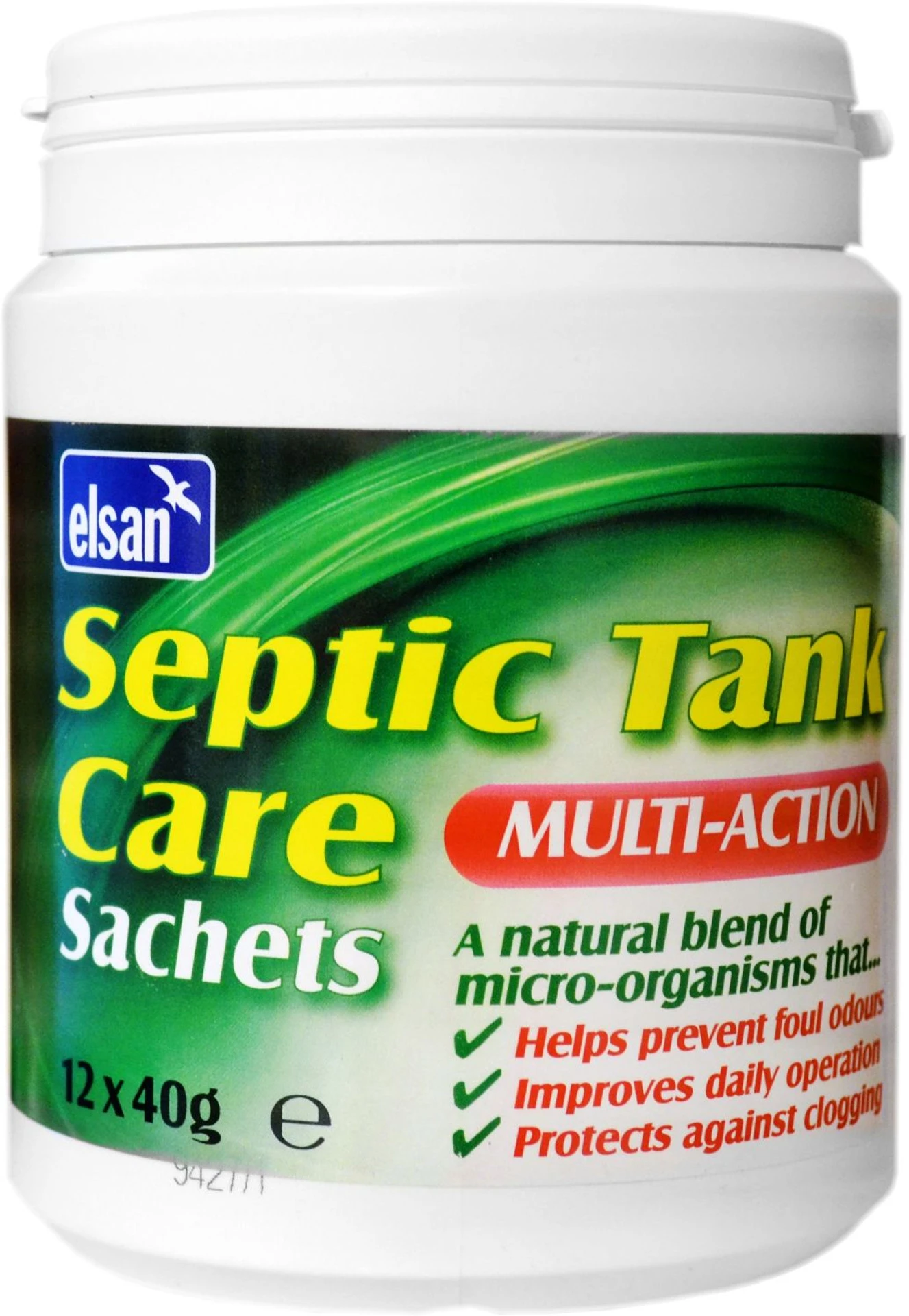 A natural blend of micro-organisms that help protect your Septic Tank against the build-up of solid deposits – system back up and foul odours.Elsan Septic Tank Care uses the processes found in nature to keep your septic tank functioning at its best. As well as adding bacteria to optimise the decomposition of toilet solids it also introduces carefully selected microorganisms – not normally present – that will digest fat – oil – and grease to prevent blockages in the system or the drain filed. Elsan Septic Tank Care Multi-action is supplied in packs of 12 convenient Water Soluble Sachets for 12 months usage.